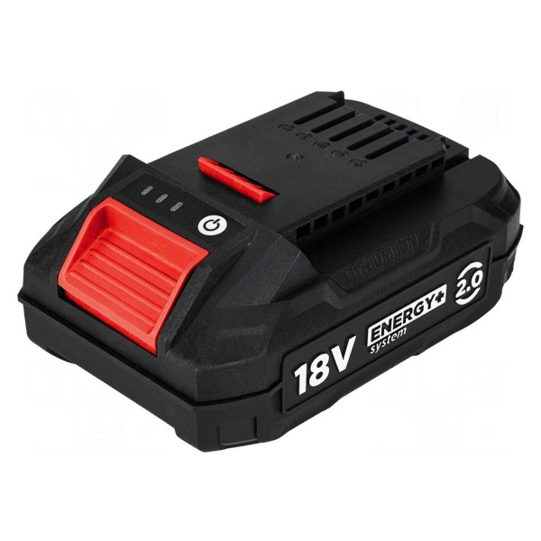 Akumulator wykonany w technologii litowo-jonowej przeznaczony jest do zasilania urządzeń z serii Energy+. Napięcie znamionowe ogniwa wynosi 18V, a jego pojemność to 2Ah.