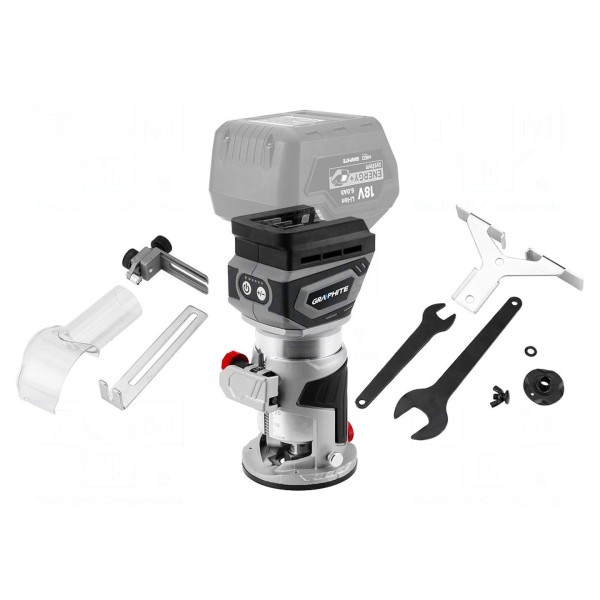 Urządzenie zasilane jest napięciem 18V DC z systemu Energy+. Konstrukcja frezarki została wyposażona w blokadę włącznika oraz ogranicznik głębokości wiercenia, co wpływa na obsługę urządzenia podczas pracy. Narzędzie nie zawiera akumulatorów w zestawie.