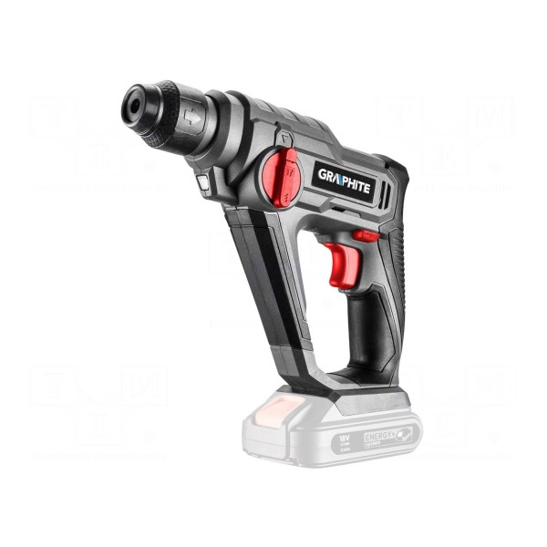 Młotowiertarka GRAPHITE 58G009 to narzędzie akumulatorowe zasilane napięciem 18V DC. Urządzenie wyposażone jest w silnik szczotkowy oraz uchwyt typu SDS-Plus, co pozwala na sprawne mocowanie osprzętu. Prędkość obrotowa wynosi od 0 do 900 obr./min, a energia udaru osiąga wartość 0,8J.