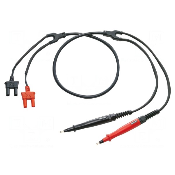 Akcesorium zostało wyposażone w dwie końcówki pomiarowe oraz dwa wtyki bananowe podwójne, co umożliwia stabilne połączenie z przyrządem pomiarowym oraz punktem testowym. Całkowita długość przewodu wynosi 1,4m, co zapewnia zasięg roboczy w typowych stanowiskach laboratoryjnych.