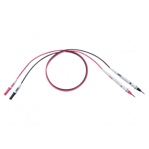 Zestaw zawiera przewody w kolorze czarnym i czerwonym, co ułatwia identyfikację polaryzacji podczas pracy. Produkt charakteryzuje się standardowym wykonaniem dla końcówek typu banan 4 mm, zapewniając kompatybilność z przyrządami pomiarowymi wyposażonymi w odpowiednie gniazda.