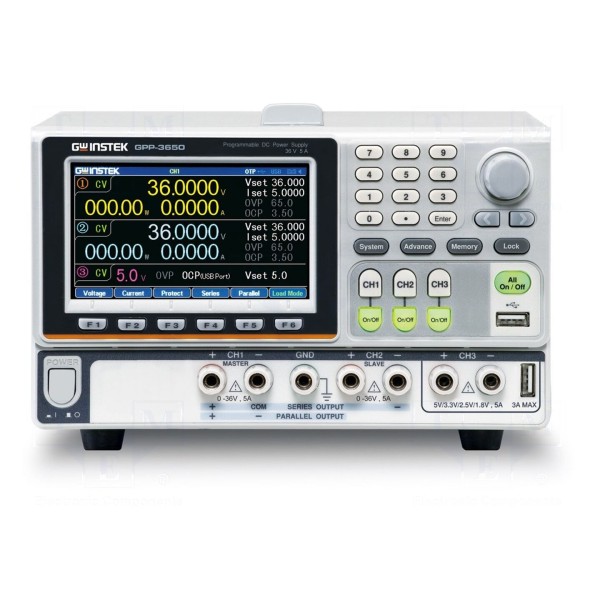 Zasilacz laboratoryjny GW INSTEK GPP-3650L to programowalne urządzenie wielokanałowe wyposażone w trzy wyjścia. Kanały pierwszy i drugi oferują napięcie wyjściowe w zakresie 0–36V DC przy prądzie do 5A, natomiast trzeci kanał zapewnia stałe napięcia wyjściowe 1,8V, 2,5V, 3,3V lub 5V DC przy obciążalności prądowej 5A. Urządzenie pozwala na pracę dwóch regulowanych sekcji w trybach stabilizacji prądowej lub napięciowej, a także w konfiguracjach szeregowych, równoległych lub niezależnych.