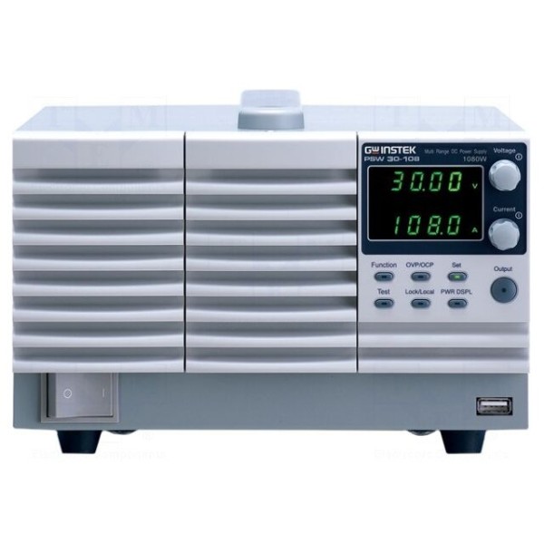 Programowalny zasilacz impulsowy GW INSTEK PSW 30-108 to jednokanałowe urządzenie o mocy maksymalnej 1,08kW. Model ten oferuje regulowane napięcie wyjściowe w zakresie od 0 do 30V DC oraz prąd wyjściowy do 108A. Zasilacz przystosowany jest do pracy z napięciem zasilania w zakresie od 85 do 265V AC.