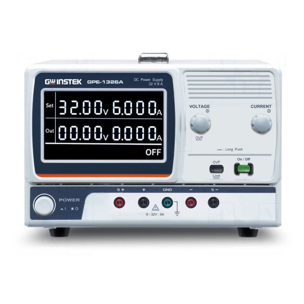 Zasilacz laboratoryjny GW INSTEK GPE-1326A to liniowe urządzenie jednokanałowe prądu stałego DC. Zakres regulacji napięcia wyjściowego wynosi od 0 do 32V DC, natomiast zakres prądu wyjściowego mieści się w przedziale od 0 do 6A. Parametry pracy są kontrolowane z rozdzielczością 10mV dla napięcia oraz 2mA dla prądu wyjściowego.