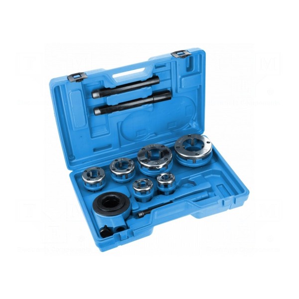 Zestaw zawiera gwintownicę do rur przeznaczoną do wykonywania połączeń gwintowanych. W skład kompletu wchodzą głowice o wymiarach 1/2", 3/4", 1", 1 1/4", 1 1/2" oraz 2".