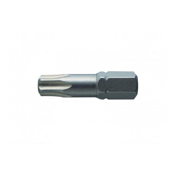 Końcówka wkrętakowa typu Torx o rozmiarze TX30 przeznaczona jest do prac montażowych oraz serwisowych. Element charakteryzuje się długością całkowitą wynoszącą 25 mm oraz uchwytem o rozmiarze 1/4" i standardzie C6,3 mm.
