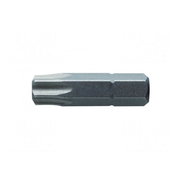 Końcówka wkrętakowa typu Torx o rozmiarze grota TX40 przeznaczona jest do prac montażowych. Element charakteryzuje się długością całkowitą 25 mm oraz standardowym uchwytem o rozmiarze 1/4", co odpowiada specyfikacji C6,3 mm.