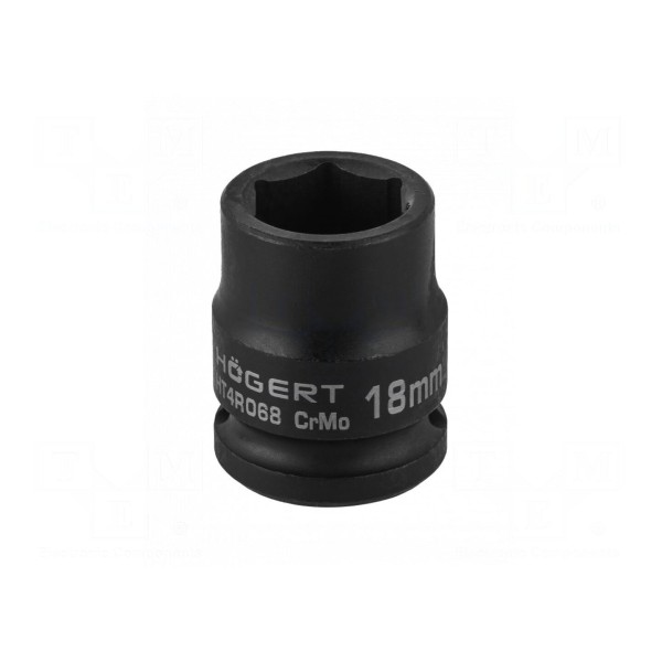 Nasadka udarowa typu 6-kątnego została wykonana ze stali chromowo-molibdenowej. Produkt posiada rozmiar gniazda HEX 18 mm oraz mocowanie na uchwyt o rozmiarze 1/2".