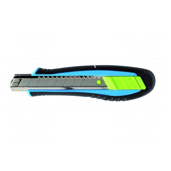Narzędzie wyposażone jest w wysuwane, łamane ostrze o szerokości 18mm, co umożliwia szybkie dostosowanie krawędzi tnącej do aktualnych potrzeb. Konstrukcja posiada zintegrowany mechanizm blokady ostrza, który zapewnia stabilność podczas pracy.