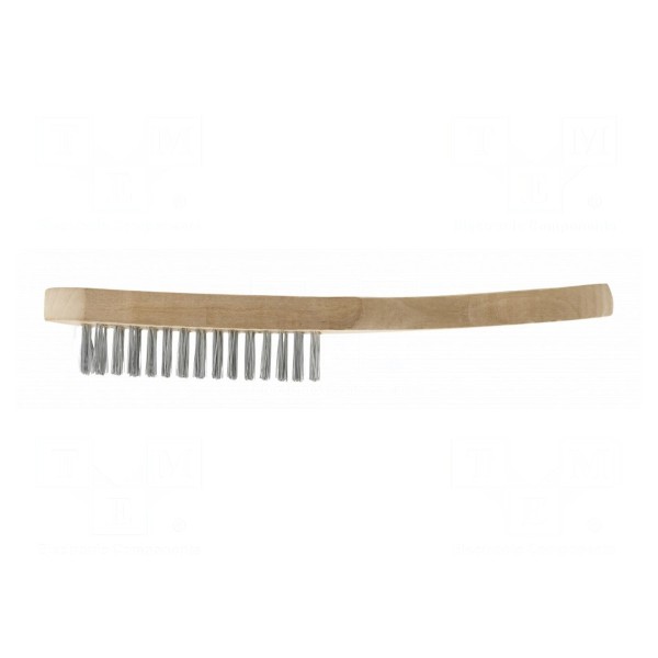 Szczotka wyposażona jest w drut stalowy oraz drewnianą rękojeść. Konstrukcja narzędzia składa się z pięciu rzędów drutu, co przekłada się na efektywność pracy podczas obróbki powierzchni. Całkowita długość produktu wynosi 290mm.