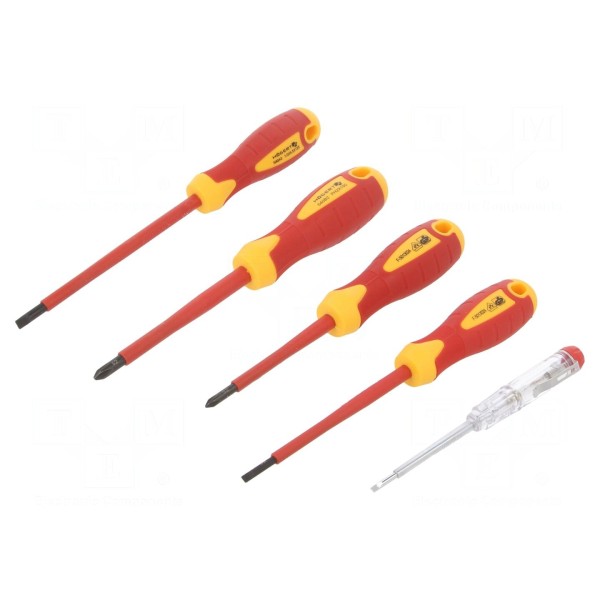 Zestaw składa się z pięciu izolowanych wkrętaków przeznaczonych do pracy pod napięciem do 1kV AC. W komplecie znajdują się groty typu Phillips w rozmiarach PH1 i PH2 oraz płaskie o rozmiarach SL 3,5 i SL 5,5. Całość wykonano ze stali stopowej, co zapewnia odpowiednią wytrzymałość narzędzi.