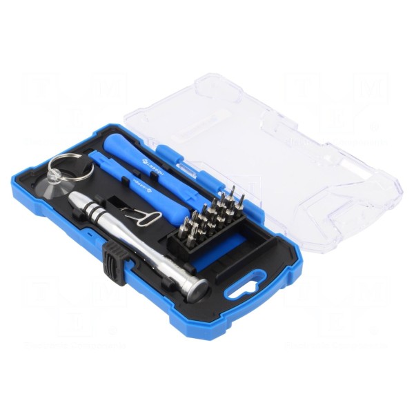 Zestaw zawiera 17 elementów przeznaczonych do prac wymagających wysokiej precyzji. Komplet obejmuje rękojeść wkrętakową oraz zestaw wymiennych końcówek roboczych.