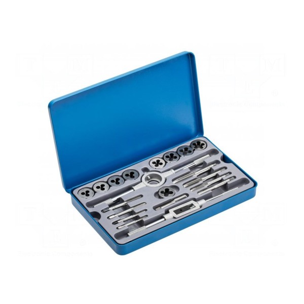 W zestawie: gwintowniki, narzynki, uchwyt do gwintowników, uchwyt do narzynek. Komplet składa się z 20 elementów zamkniętych w opakowaniu.
