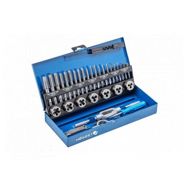 W skład zestawu wchodzi łącznie 32 elementy, co zapewnia obsługę różnych średnic gwintów. W zestawie: gwintowniki, narzynki, uchwyt do gwintowników, uchwyt do narzynek.