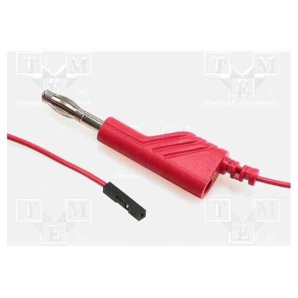 Przewód pomiarowy o długości 1m charakteryzuje się napięciem znamionowym 60V DC oraz prądem znamionowym 3A. Konstrukcja elementu obejmuje wtyk bananowy z gniazdem osiowym 4mm oraz gniazdo 0,64mm, co zapewnia wszechstronne zastosowanie w układach pomiarowych. Przekrój przewodu wynosi 0,25mm², a maksymalna rezystancja styku została określona na 70mΩ.