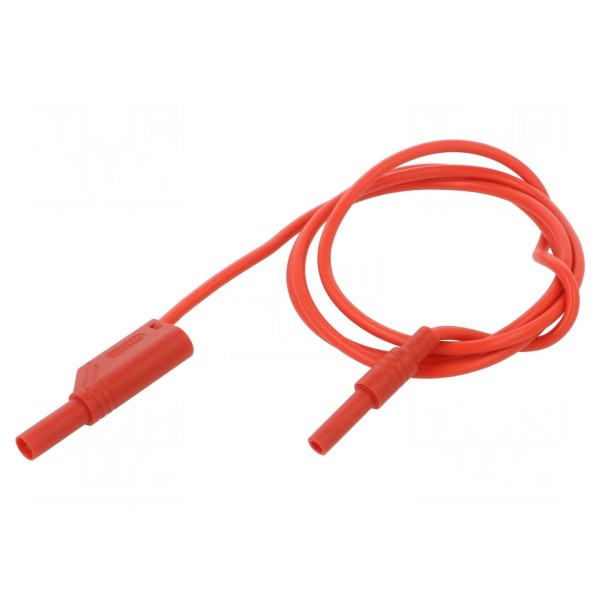 Izolacja przewodu wykonana jest z PVC w kolorze czerwonym, co zapewnia ochronę i elastyczność w zakresie temperatur pracy od -15°C do 70°C. Produkt charakteryzuje się zgodnością z normą EN 61010 oraz spełnia wymogi dla kategorii CAT II 1000V. Dzięki izolowanej konstrukcji złączy, przewód jest przystosowany do pracy w układach wymagających bezpiecznego podłączenia aparatury pomiarowej.