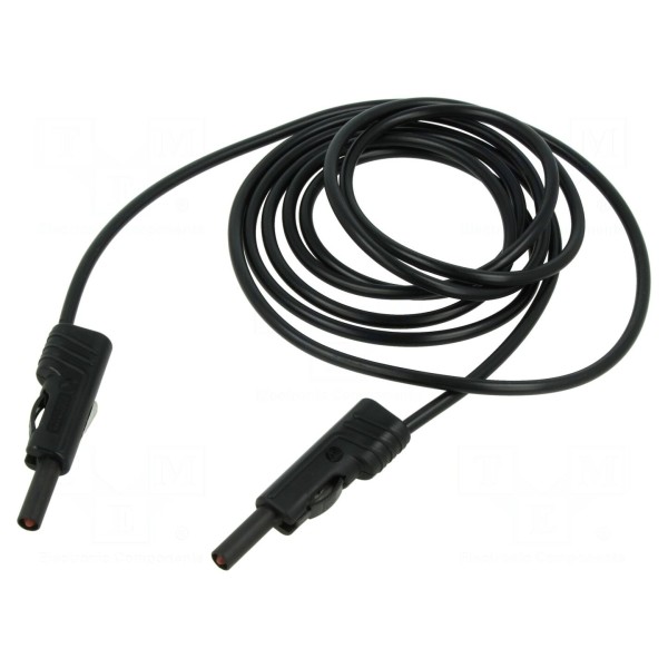 Przewód pomiarowy o długości 2 metrów wyposażony jest po obu stronach we wtyki bananowe z gniazdem osiowym 4 mm. Konstrukcja złącza jest w pełni izolowana, co pozwala na bezpieczne łączenie elementów w układach pomiarowych. Elementy stykowe wykonano z niklowanego mosiądzu, co zapewnia przewodność w zastosowaniach laboratoryjnych.