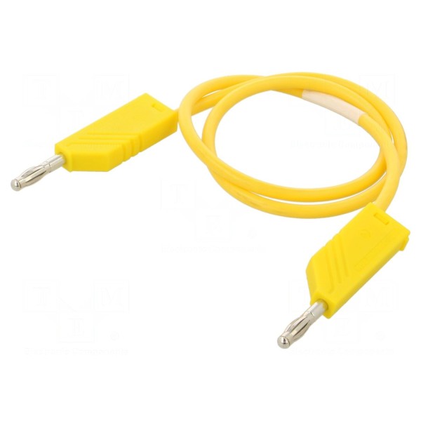 Złącza wyposażone są w wtyki bananowe z gniazdem osiowym 4 mm umieszczone po obu stronach przewodu. Styki wykonano z mosiądzu i poddano procesowi niklowania, co przekłada się na maksymalną rezystancję styku na poziomie 20 mΩ. Element posiada żółty kolor izolacji.