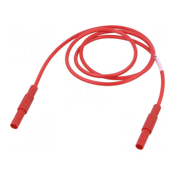 Przewód pomiarowy o długości 1m charakteryzuje się prądem znamionowym 16A oraz napięciem znamionowym 1kV. Wyposażony jest w izolowane wtyki bananowe 4mm umieszczone po obu stronach przewodu.
