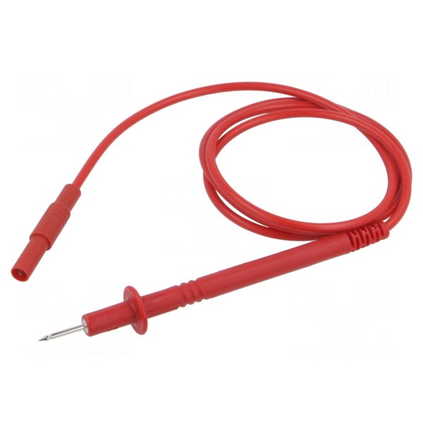 Elementy stykowe wykonano z niklowanego mosiądzu, zapewniając odpowiednią przewodność połączeń. Zakończenie przewodu stanowi końcówka pomiarowa oraz wtyk bananowy 4 mm. Produkt jest zgodny z normą EN 61010 i spełnia wymagania kategorii bezpieczeństwa CAT II 1000V.