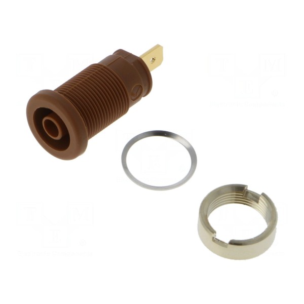 Komponent wykonany został z mosiądzu z pozłacaną powierzchnią styku, co zwiększa jego odporność na utlenianie. Izolacja elementu została wyprodukowana z poliamidu w kolorze brązowym, a całkowita długość złącza wynosi 32 mm. Urządzenie spełnia wymagania normy EN 61010 oraz posiada certyfikację CAT III 1000 V.