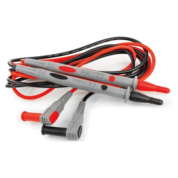 Konstrukcja kabli obejmuje dwie końcówki pomiarowe oraz dwa kątowe wtyki bananowe o średnicy 4mm. Akcesoria spełniają wymagania bezpieczeństwa zgodnie z normami CAT III 1000V oraz CAT IV 600V.