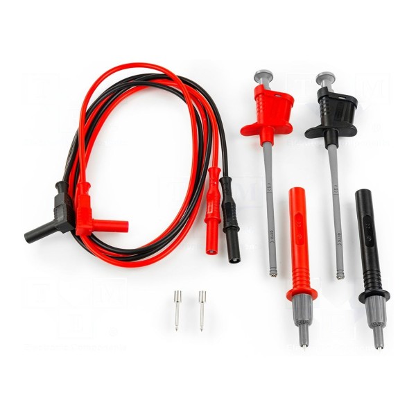 Akcesoria spełniają wymogi norm bezpieczeństwa CAT III 1000V oraz CAT IV 600V. W zestawie: 2x przewód 2m z wtykiem bananowym prostym 4mm i wtykiem bananowym kątowym 4mm, 2x chwytak pomiarowy, 4x końcówka pomiarowa 4mm.