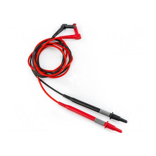 Zestaw składa się z dwóch przewodów pomiarowych o długości 1 metra każdy, zakończonych z jednej strony końcówką pomiarową, a z drugiej kątowym wtykiem bananowym 4mm. Akcesoria zostały przystosowane do pracy z napięciem maksymalnym 1kV oraz prądem o natężeniu do 20A.