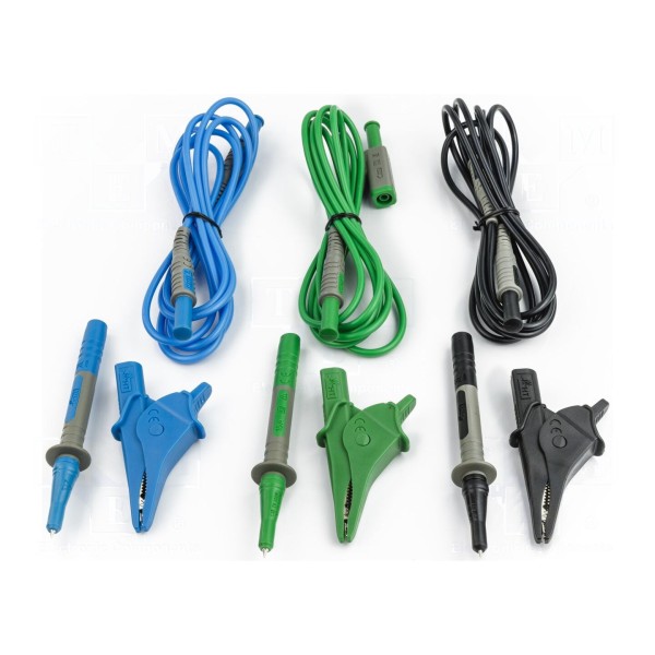 Zestaw przewodów i adapterów przeznaczony jest do wykonywania pomiarów elektrycznych przy napięciu znamionowym do 1kV oraz prądzie do 10A. Elementy kompletu charakteryzują się długością przewodów wynoszącą 2m, a maksymalne rozwarcie szczęk wykorzystywanych w zestawie adapterów wynosi 40mm. Komponenty dostępne są w trzech kolorach: czarnym, niebieskim i zielonym.