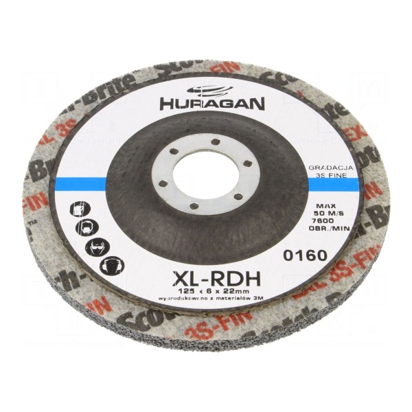 Tarcza szlifierska HURAGAN wykonana z włókniny przeznaczona jest do prac obróbczych. Element posiada średnicę zewnętrzną 125mm oraz grubość wynoszącą 6mm.