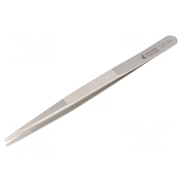 Pęseta prosta IDEAL-TEK 121.SA to narzędzie o długości 160 mm, wykonane ze stali nierdzewnej. Zastosowany materiał zapewnia odporność na działanie większości kwasów oraz związków chemicznych.