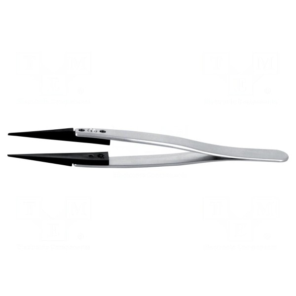 Pęseta typu ESD o długości 115 mm została wyposażona w wymienne końcówki wykonane z włókna węglowego. Narzędzie posiada ostry kształt końcówki, który umożliwia precyzyjne operowanie małymi elementami w środowiskach wymagających ochrony przed wyładowaniami elektrostatycznymi.