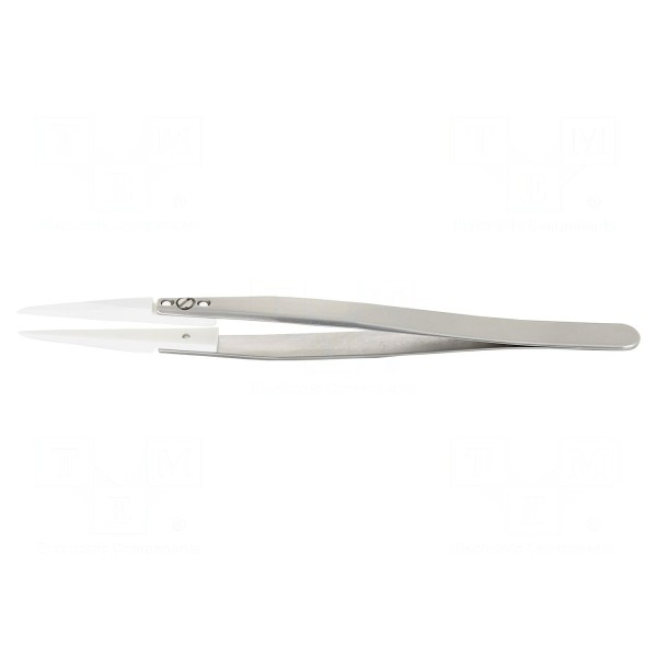 Narzędzie typu pęseta charakteryzuje się długością 135 mm oraz płaskim kształtem końcówki. Wyposażone jest w wymienne końcówki wykonane z materiału ceramicznego, co pozwala na ich wymianę w razie potrzeby.
