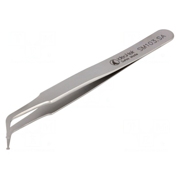 Narzędzie typu pęseta o długości 115 mm przeznaczone do precyzyjnych prac z komponentami SMD. Posiada zagięty kształt ostrzy wyposażonych w specjalne zakończenia, co ułatwia manipulację drobnymi elementami elektronicznymi.