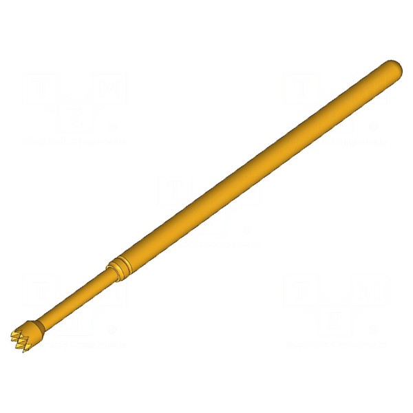 Igła testowa INGUN GKS-100 306 150 A 2200 to komponent przeznaczony do układów pomiarowych, charakteryzujący się prądem znamionowym 8A. Element posiada ząbkowaną końcówkę o średnicy 1,5mm, wykonaną z brązu berylowego (CuBe) z powierzchnią pozłacaną. Konstrukcja zapewnia maksymalną rezystancję styku na poziomie 20mΩ.