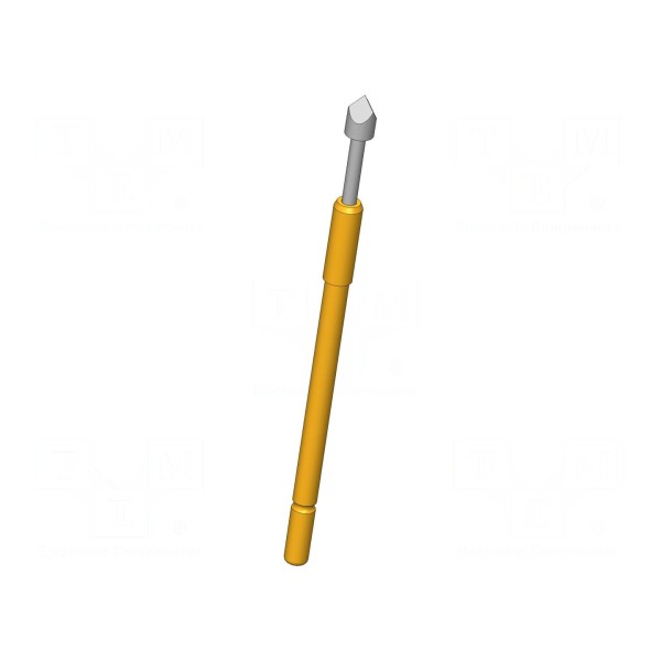 Igła testowa o długości 36,3 mm przeznaczona jest do systemów testowych wymagających obciążalności prądowej do 5 A. Konstrukcja elementu charakteryzuje się siłą ugięcia sprężyny wynoszącą 2,25 N oraz maksymalną rezystancją styku na poziomie 20 mΩ. Komponent posiada ostre zakończenie o średnicy 2 mm, co umożliwia punktowy kontakt z badanym obiektem.