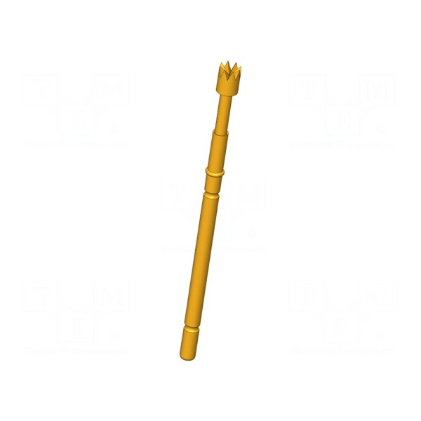 Igła testowa INGUN GKS-912 288 230 A 5005 przeznaczona jest do systemów pomiarowych, oferując obciążalność prądową na poziomie 5A. Element posiada końcówkę w kształcie 8-punktowej korony o średnicy 2,3mm, wykonaną ze stali i pokrytą warstwą złota, co wpływa na parametry kontaktowe styku.