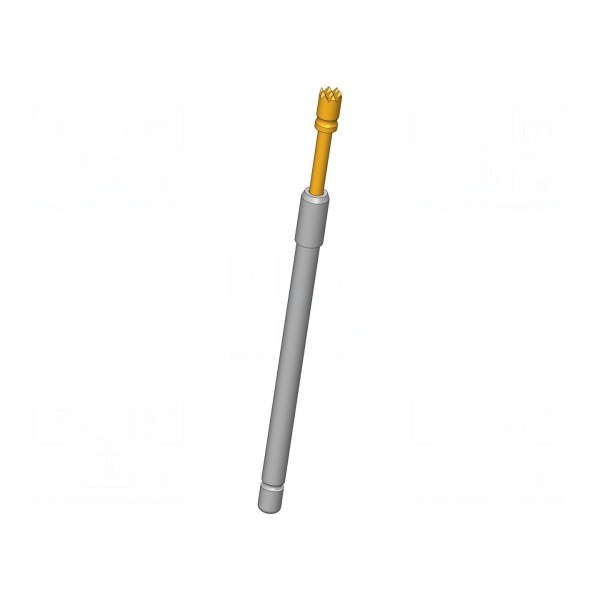 Igła testowa o długości 34,3 mm została wykonana z miedzi berylowej (CuBe) ze złoconą powłoką styku. Element charakteryzuje się prądem znamionowym 20 A oraz maksymalną rezystancją styku wynoszącą 10 mΩ. Konstrukcja z końcówką ząbkowaną o średnicy 1,6 mm zapewnia stabilność połączenia w trakcie testów.