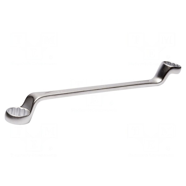 Konstrukcja narzędzia obejmuje odgięte główki oczkowe, które ułatwiają dostęp do elementów złącznych w miejscach o ograniczonej przestrzeni. Produkt został wykonany ze stali, a jego powierzchnia jest chromowana w celu ochrony przed czynnikami zewnętrznymi. Narzędzie jest zgodne z normami DIN 838 oraz ISO 10104.