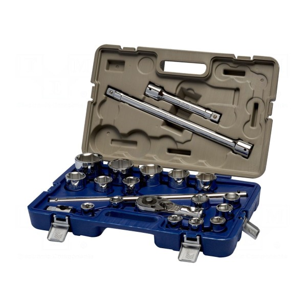 Komplet pozwala na obsługę połączeń śrubowych w szerokim zakresie rozmiarów. Całość zestawu została skompletowana w celu zapewnienia niezbędnego osprzętu do eksploatacji urządzeń wyposażonych w napęd 3/4 cala.