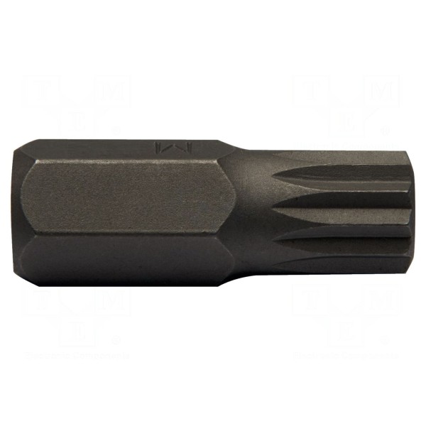 Końcówka wkrętakowa typu spline o profilu XZN M10 przeznaczona jest do współpracy z uchwytami o gnieździe sześciokątnym 10mm. Element charakteryzuje się 12-kątnym rodzajem grota, co umożliwia odpowiednie dopasowanie do śrub z gniazdem wielowypustowym.