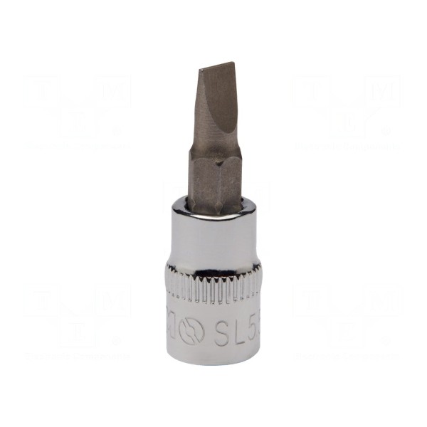 Nasadka klucza nasadowego wyposażona w grot płaski o rozmiarze 5,5x1mm. Narzędzie zostało zaprojektowane do współpracy z gniazdami o rozmiarze 1/4".