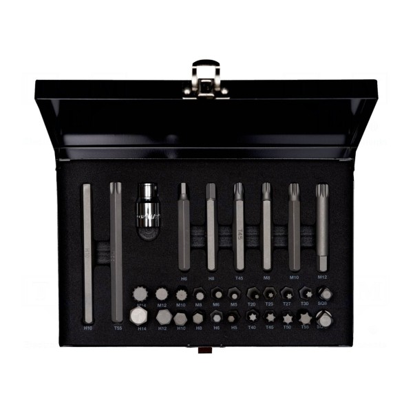 Zestaw zawiera końcówki wkrętakowe o różnorodnych profilach, w tym imbus, kwadrat, spline (12-kątne) oraz Torx. Łącznie komplet składa się z 31 elementów, co pozwala na wszechstronne zastosowanie podczas prac montażowych i serwisowych.