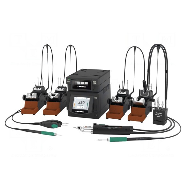 W zestawie: stacja bazowa, moduł podciśnienia JBC-MSE-B, lutownica JBC-T210-A, lutownica JBC-T245-A, rozlutownica JBC-DR560-A, gorące mikroszczypce JBC-AM120-A, pedał JBC-P405, podstawka JBC-AD-SF (2 sztuki), podstawka JBC-AM-SB, podstawka JBC-DR-SF oraz stojak na groty JBC-SCH-A.