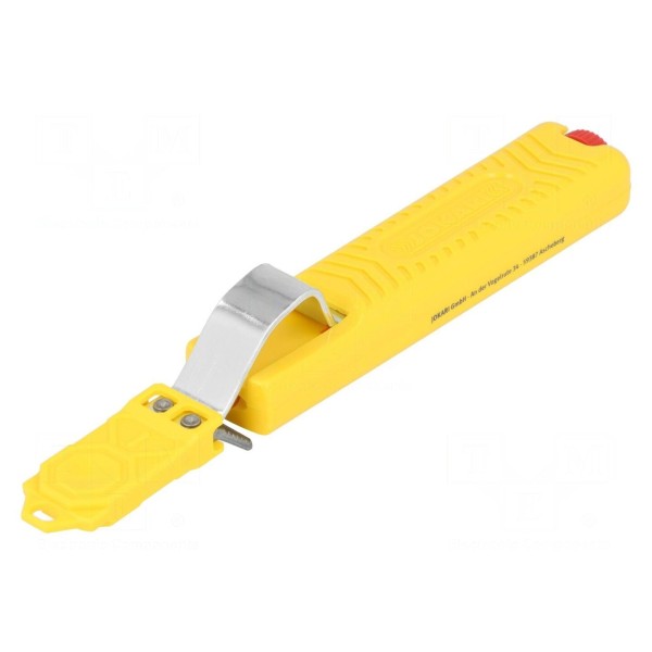 Ściągacz izolacji JOKARI 10282 przeznaczony jest do obróbki przewodów okrągłych o średnicy zewnętrznej mieszczącej się w zakresie od 8 do 28 mm. Korpus narzędzia został wykonany z poliamidu, natomiast elementy robocze pokryto azotkiem tytanu, co wpływa na parametry użytkowe przyrządu.