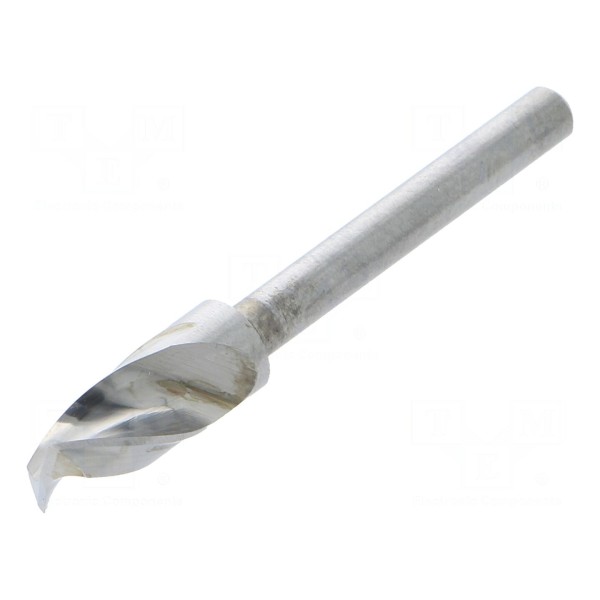 Wiertło przeznaczone do obróbki płytek drukowanych. Narzędzie zostało wykonane z węglika wolframu, co zapewnia odpowiednią trwałość podczas pracy z materiałami stosowanymi w elektronice.