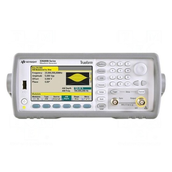 Generator laboratoryjny KEYSIGHT 33521B to urządzenie jednokanałowe oferujące szeroki zakres generowanych przebiegów, w tym sinus, prostokąt, impuls, trójkąt oraz przebiegi arbitralne. Urządzenie charakteryzuje się maksymalną częstotliwością pracy wynoszącą 30MHz przy częstotliwości próbkowania 250Msps oraz rozdzielczości pionowej 16bit. Zakres częstotliwości dla przebiegów sinusoidalnych, prostokątnych i impulsowych mieści się w granicach od 1µHz do 30MHz, natomiast dla przebiegów trójkątnych sięga 200kHz.