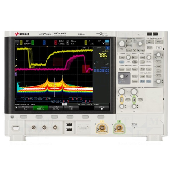 Oscyloskop sygnałów mieszanych MSOX6002A oferuje pasmo przenoszenia 1GHz oraz próbkowanie na poziomie 20Gsps. Urządzenie wyposażono w dwa kanały analogowe, a jego rozdzielczość pionowa wynosi 8 bitów. Czas narastania sygnału nie przekracza 350ps, natomiast długość rekordu pamięci wynosi 4Mpts. Sprzężenie wejścia obsługuje tryby AC oraz DC przy impedancji wejściowej 1MΩ/14pF i czułości wejściowej w zakresie od 1mV/dz do 5V/dz.