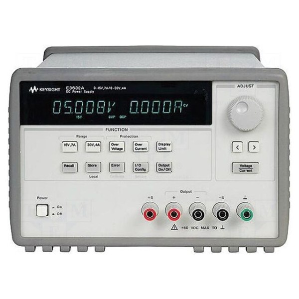 Zasilacz laboratoryjny KEYSIGHT E3632A to jednokanałowe urządzenie programowalne o mocy maksymalnej 120W. Przyrząd oferuje parametry wyjściowe na poziomie 0–15V przy prądzie 7A oraz 0–30V przy prądzie 4A, zasilany jest napięciem 230V AC. Urządzenie zapewnia wysoką precyzję pracy dzięki rozdzielczości napięcia wyjściowego 1mV oraz rozdzielczości prądu wyjściowego 0,5mA.