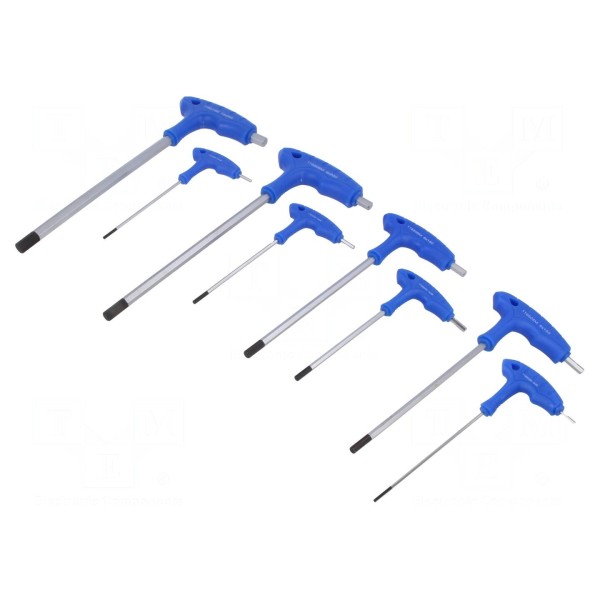 Konstrukcja narzędzi pozwala na wykorzystanie długiego ramienia do zwiększenia momentu obrotowego lub krótkiego ramienia w miejscach o ograniczonej przestrzeni roboczej. Zestaw przeznaczony jest do prac serwisowych i montażowych wymagających obsługi śrub z gniazdem typu HEX.